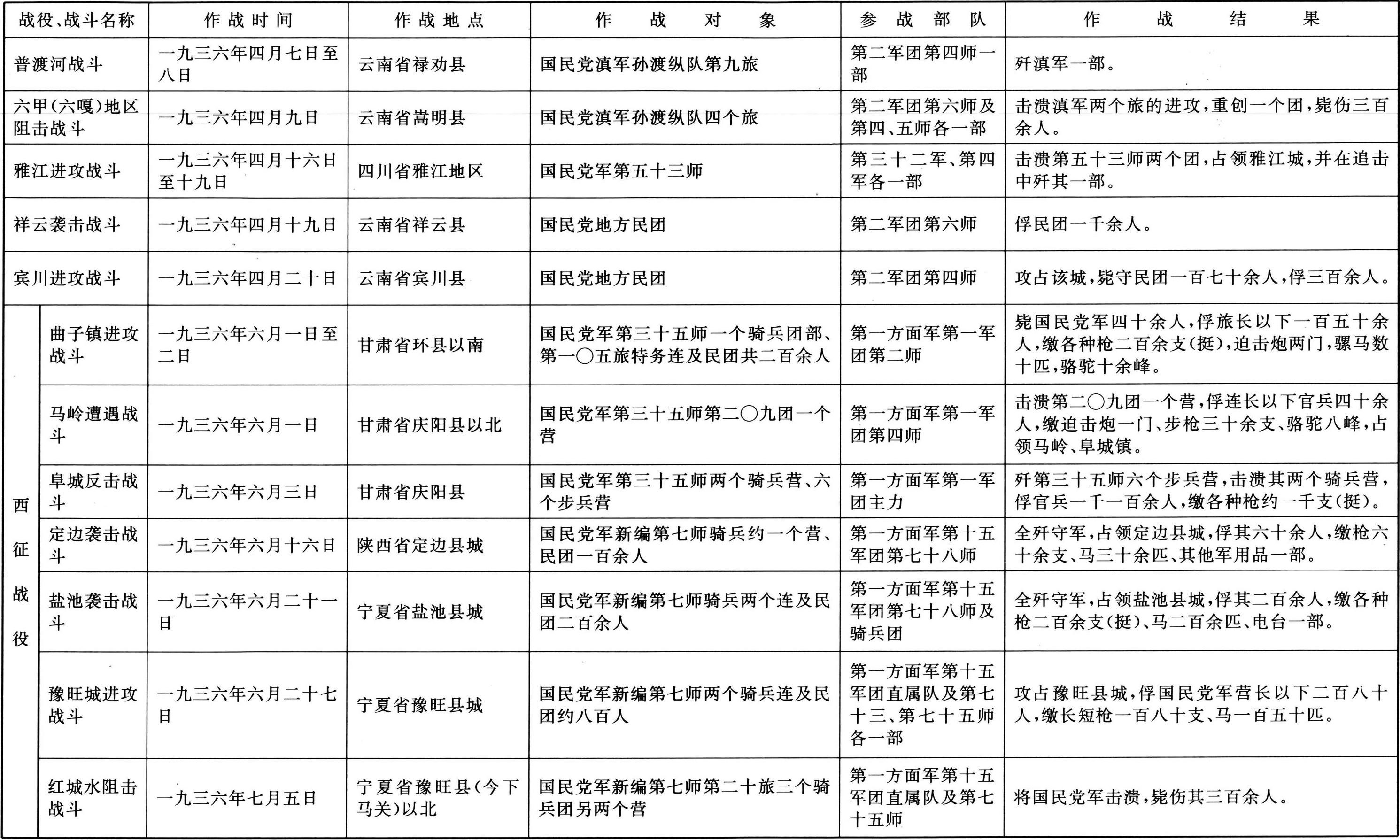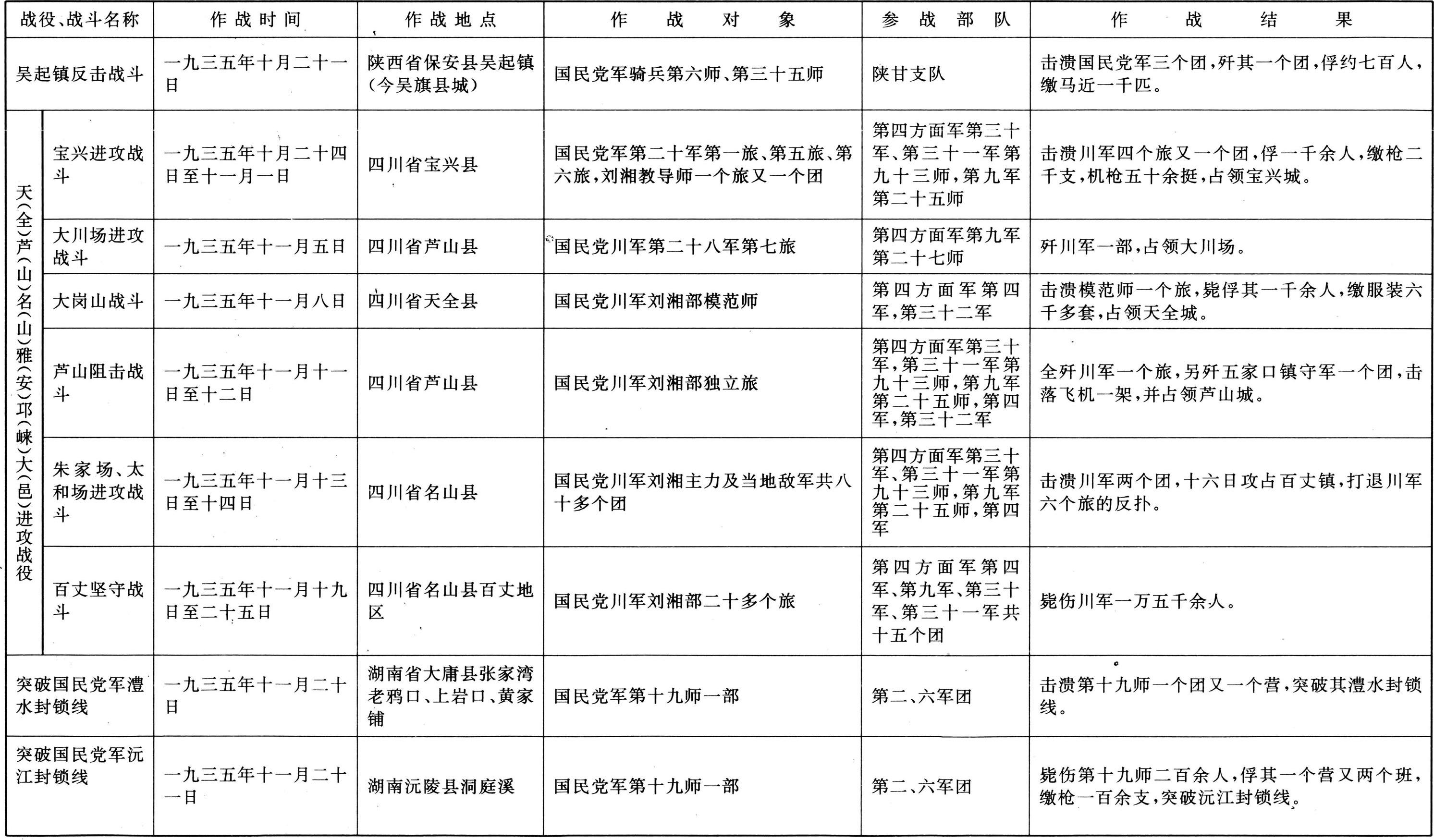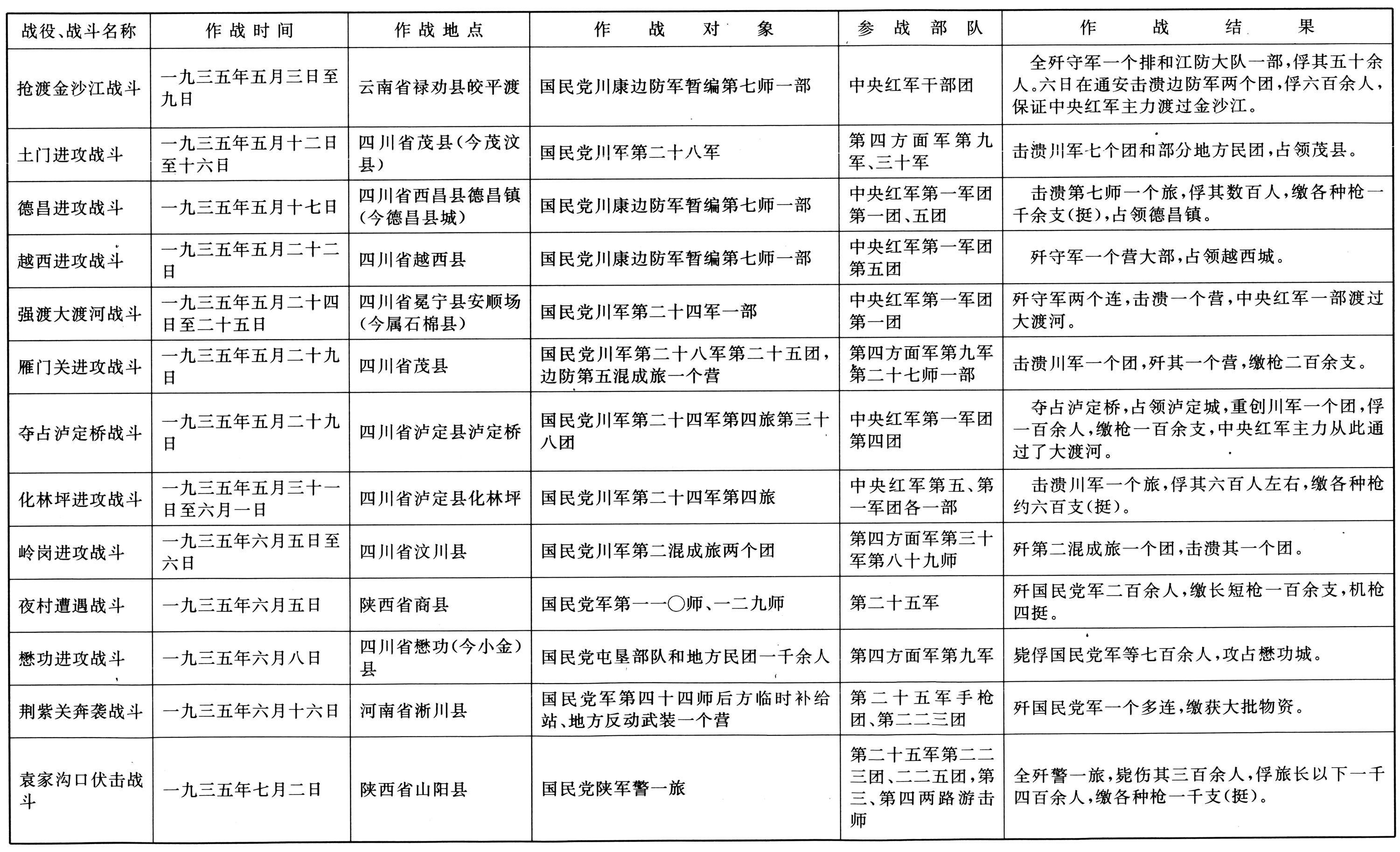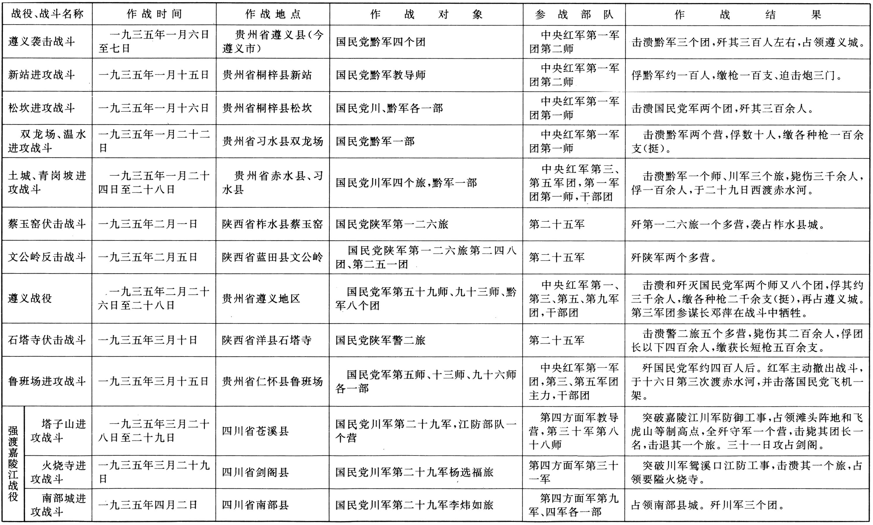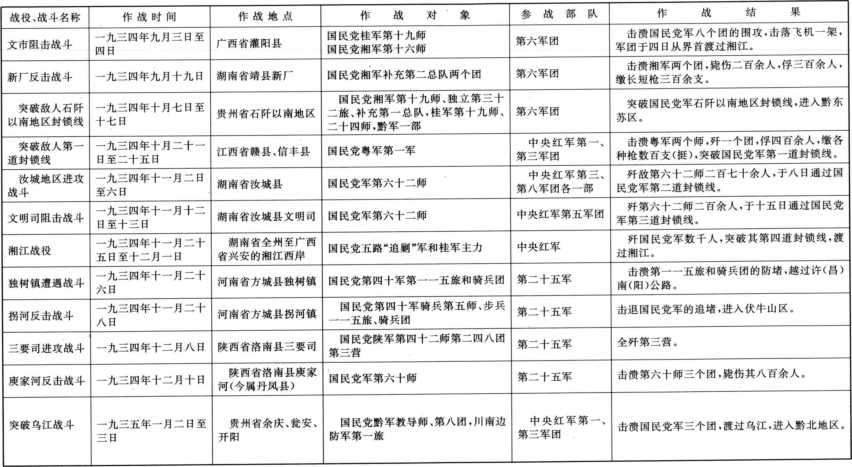 红军长征期间师以上部队主要战役、战斗战绩统计